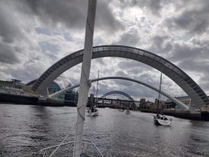 Tuesday morning the wind was blowing strongly as predicted from the south. The Millennium Bridge was booked to open at 16.30hrs. Over two locks the fleet dressed the boats with flags and gathered outside the RQ waiting pontoons. With Tyne VTS advised and a clear report of no commercial traffic at 14.30hrs the fleet departed for Newcastle City Marina. The wind had increased and turned into a very strong westerly of gusts often exceeding 40knots one being registered at 50knots and the boats were punching the last hour or so of the ebb. At times progress was down to less than 2knots. After approximately an hour the wind eased, as did the ebb and with some surprise they arrived at the Millennium Bridge early. A cordial rapport with the bridge operator brought the bridge tilting early and a pre planned berthing arrangement quickly had all boats moored safely. A few boxes of beers arrived courtesy of NCM and a pontoon gathering of Skippers and Crews each sharing their stories of the journey took on a party atmosphere. Raymond, the Jaunt Social Secretary and Entertainment Officer, together with Simon Fry, announced the time and location of the dinner for that night. SYC Rear Commodore Malcolm Hall awarded My Gal deck hand Clive Murray a bag of Jelly Babies for his efforts in coordinating the berthing on the pontoon.